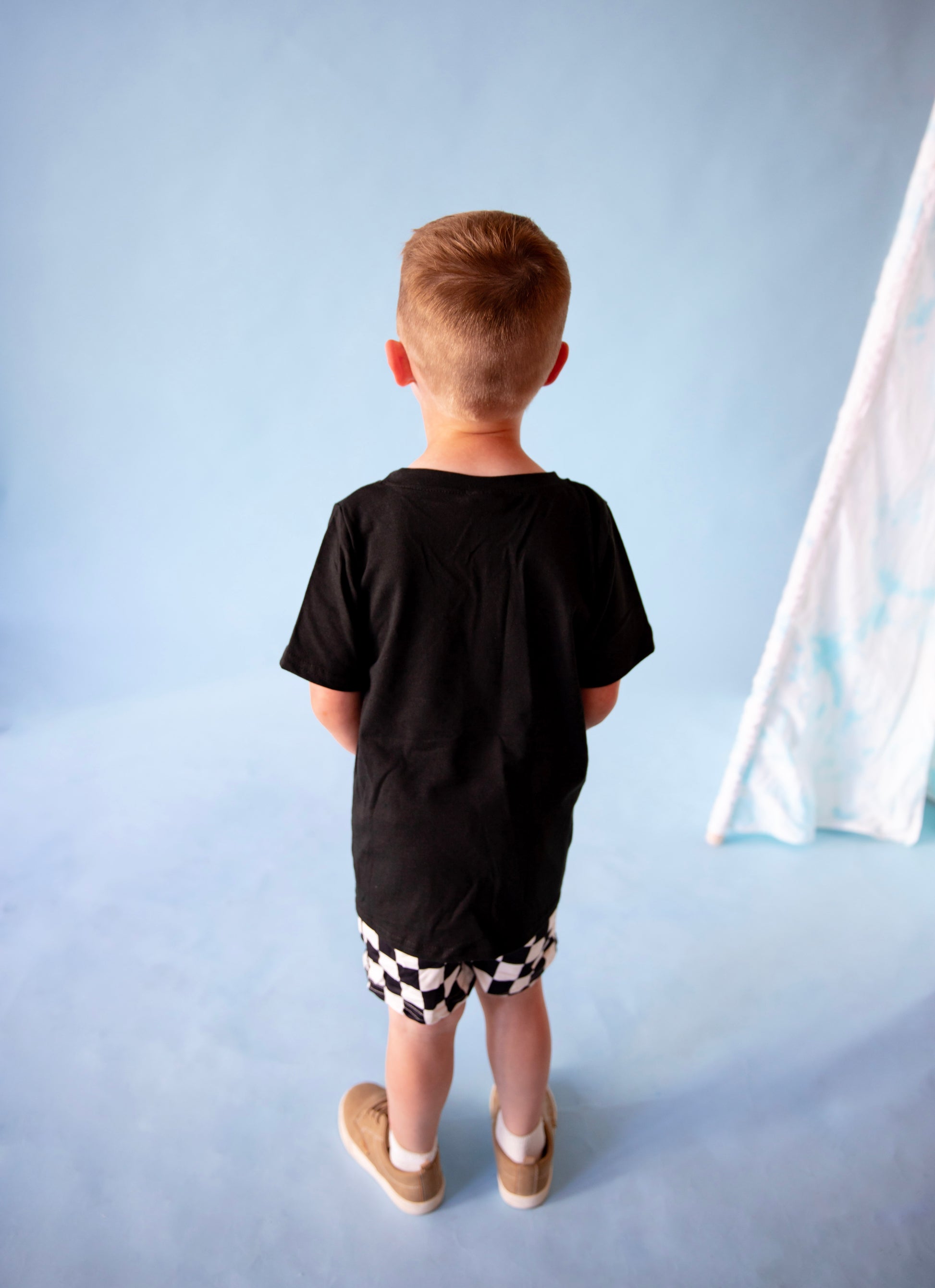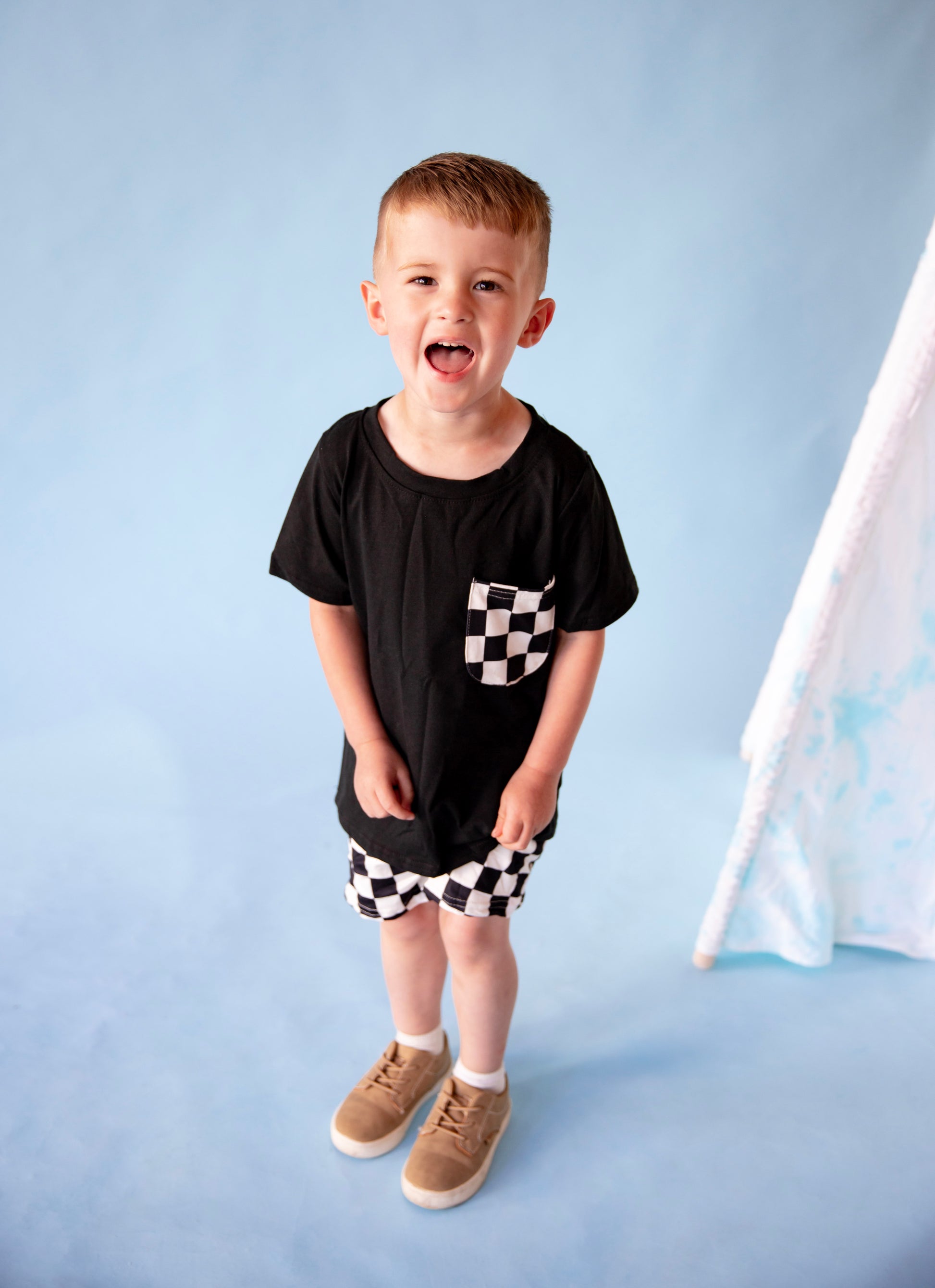 Dress in style with this classic black and white checkered print short and pocketed tee set.