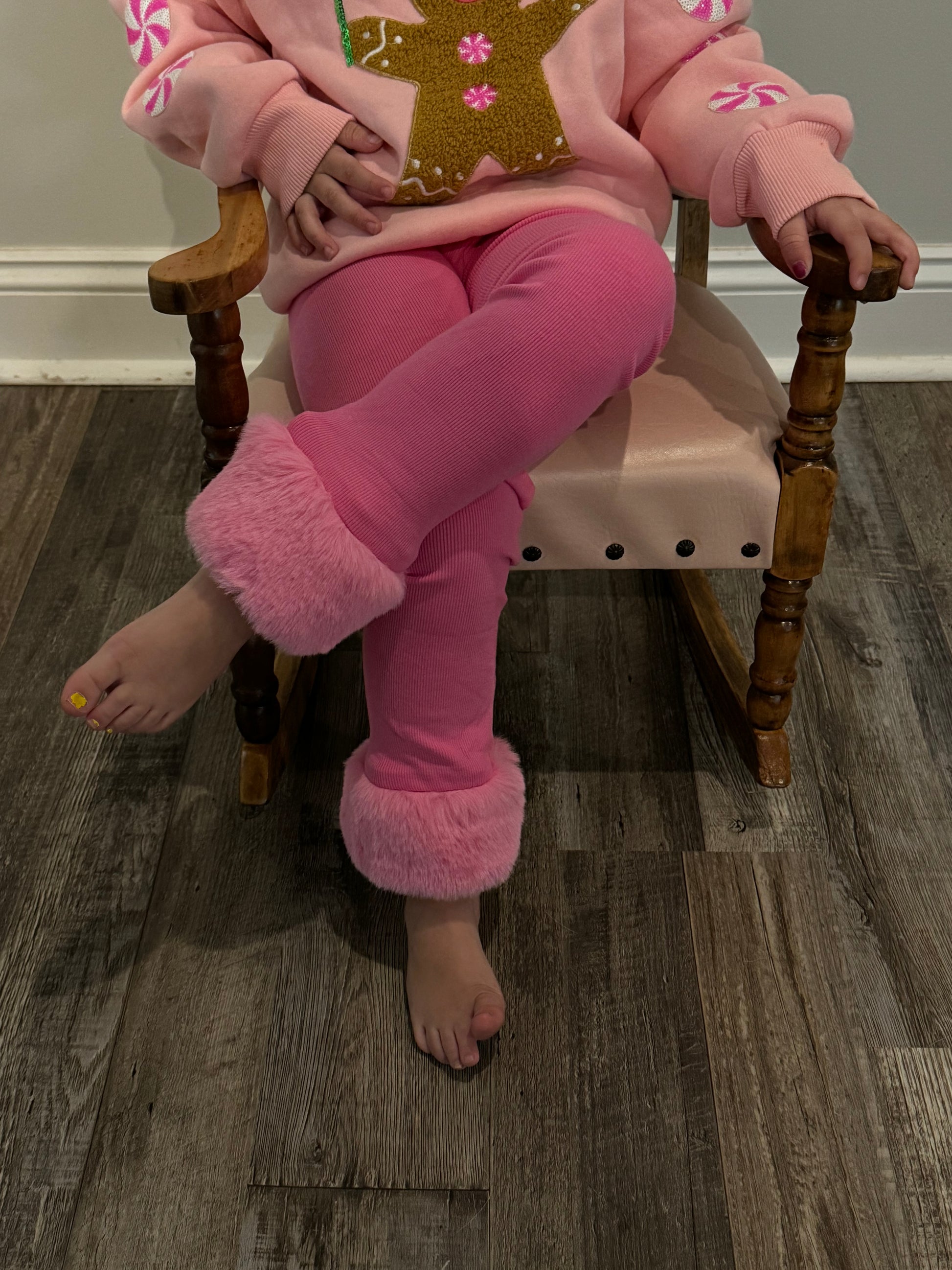 A cute pink holiday set that includes a crewneck embellished in sequin peppermint patches and a cute fuzzy gingerbread girl on the front. It’s paired with the cutest pink ribbed leggings that featured fluffy ankle cuffs!