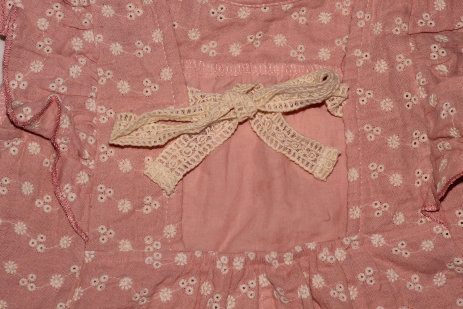 This cute pink blouse features an all over embroidered lace detail, beautiful ruffle 1/4 sleeves and an adorable bow tie in the back!
