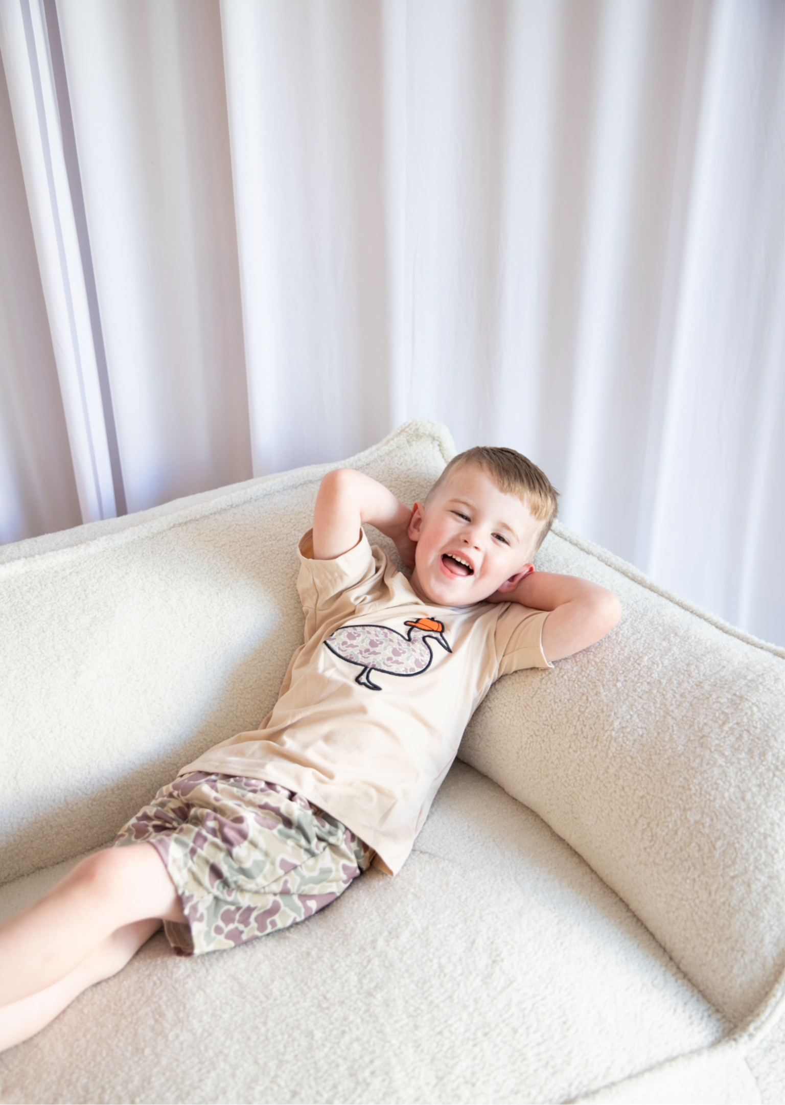 This camo short and tee set features a playful embroidered duck appliqué, complete with a cool orange hat.